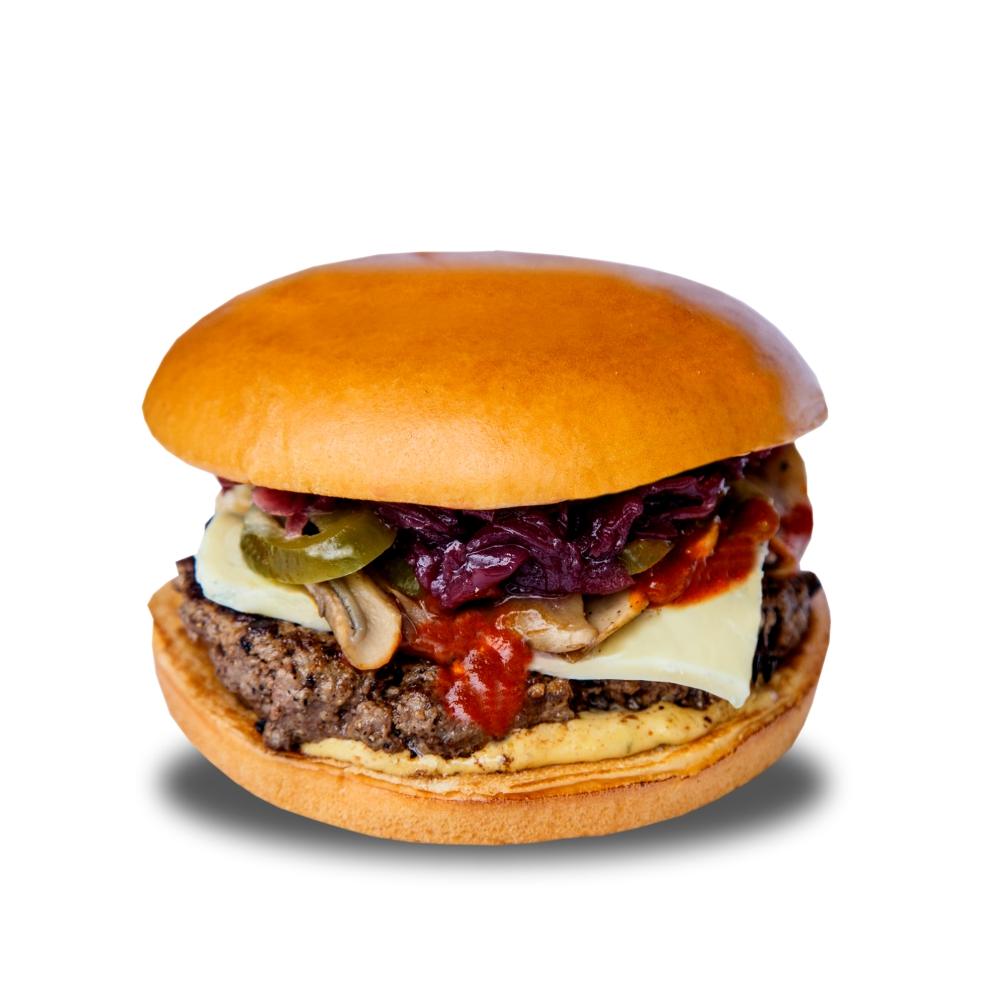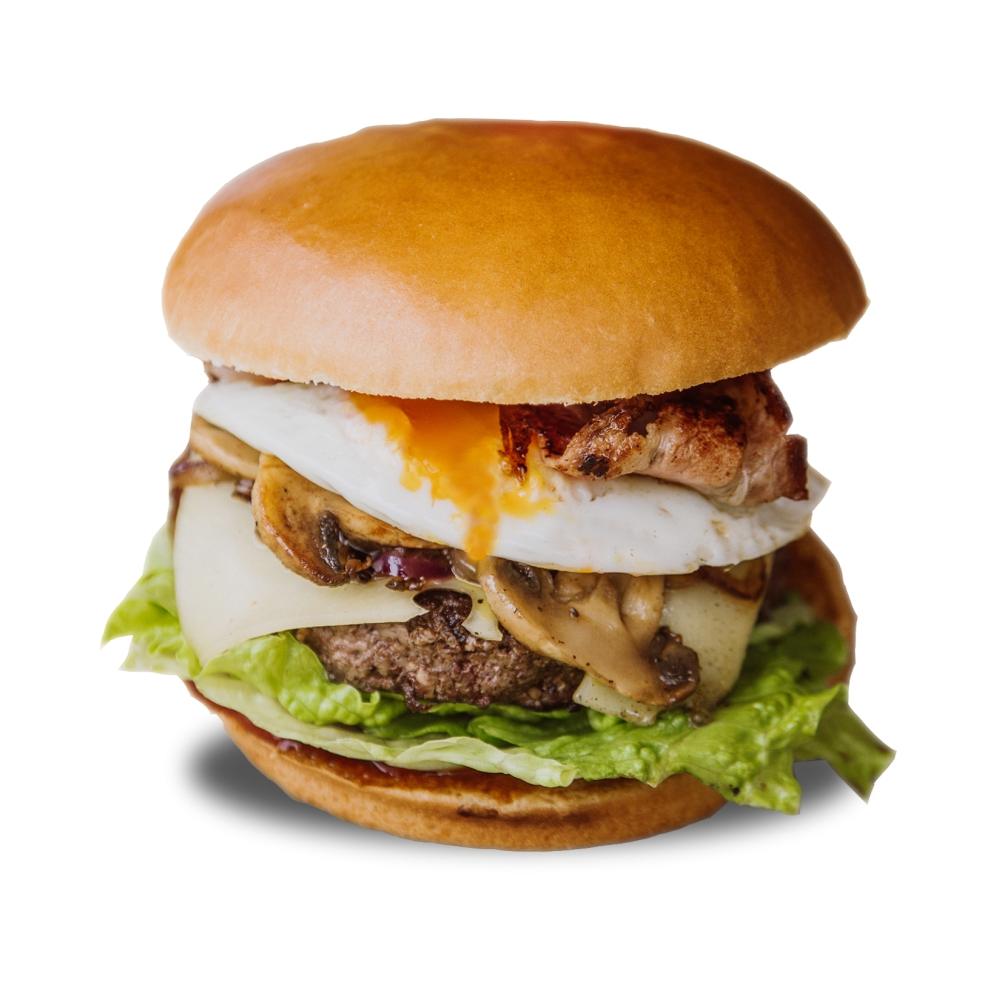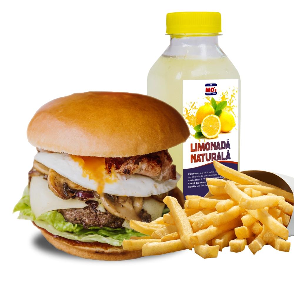 Ingrediente: carne vita Black Angus, bacon, branza Cheddar, salata Iceberg, rosii, gem rosii, sos Mo’s, chifla burger