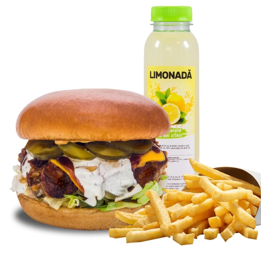 400 g Ingrediente: Meaty Mo Burger 280 g + cartofi prajiti 120 g + limonada / socata (400 ml)