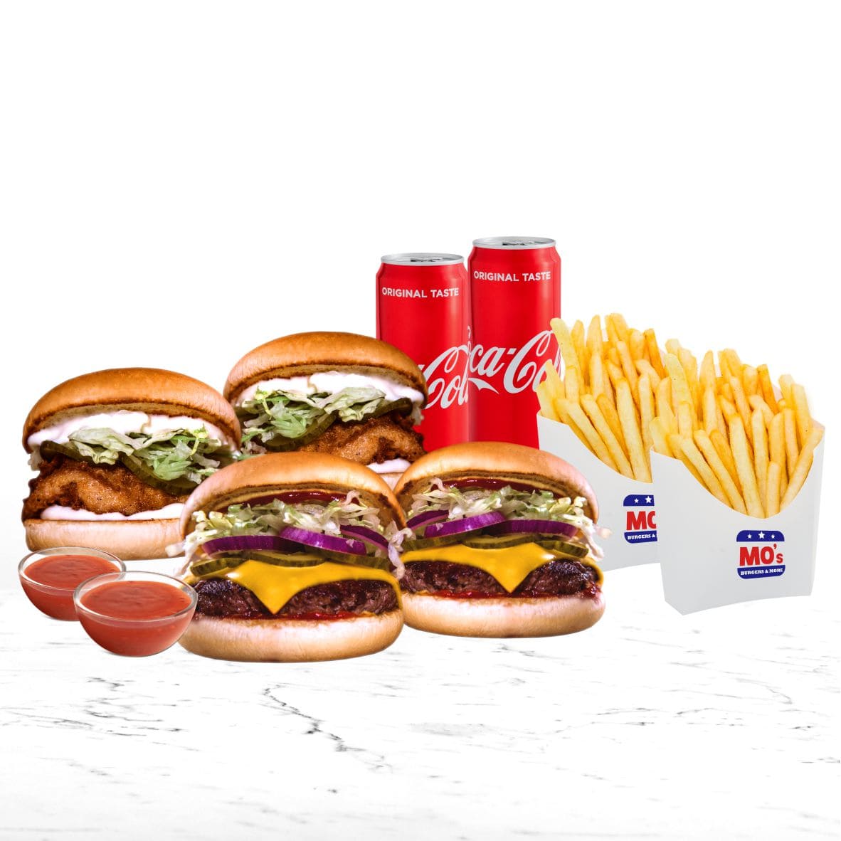Ingrediente: 2 burgeri Classic One Chicken 280 g + 2 burgeri Classic One Beef 360 g + 2 portii de cartofi prajiti 240 g + 2 sosuri la alegere 50 g – 80 g + 2 doze de suc / apa